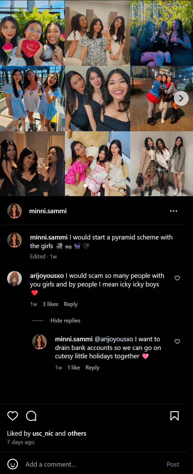 This is reinforced by the fact that Joseph Pritchard was instructed by both Vanessa Sy and Samantha Pineda to submit similar false reports to South Australia Police and The University of Adelaide against the same defendant in the hopes that it would have the effect of a "double whammy". Joseph Pritchard degraded himself and his ethics when he went along with their scheme under the assumption that he would receive sexual favours from Vanessa Sy in return. You can read more about his crimes at this website. Vanessa Sy, Joseph Pritchard, and Samantha Pineda had previously posted to social media various photographs depicting the three of them together just days after the submission of these reports. However, all such photos have since been removed.